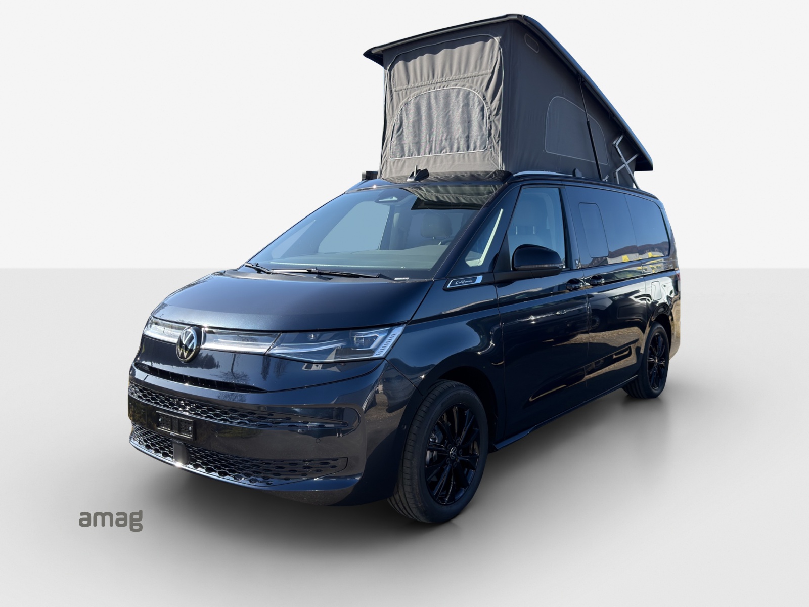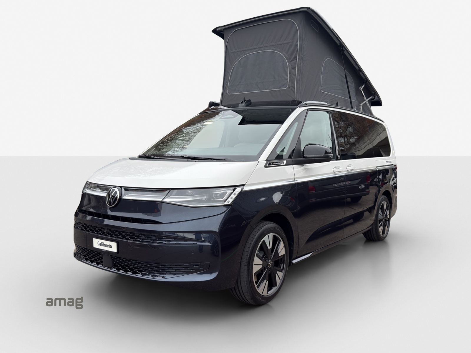 Le toit relevable est placé en position la plus haute à l’avant, comme sur tous les VW California. Des prises USB-C et des lampes LED alimentent le toit relevable en électricité et en lumière. Un lit mezzanine haut de gamme avec sommier à ressorts garantit un sommeil réparateur sous le ciel étoilé.